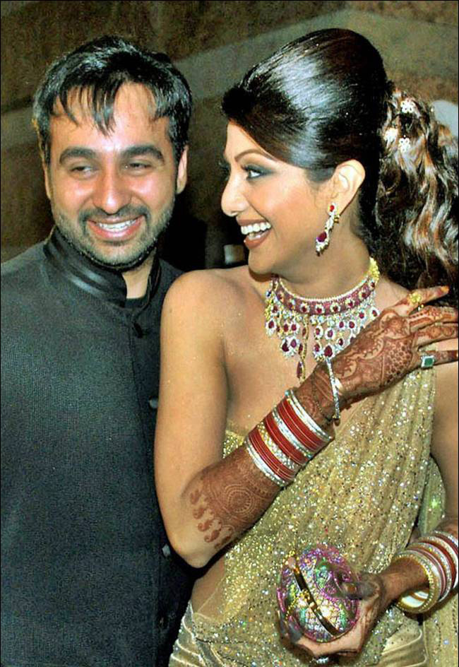 Shilpa walked in hand-in-hand with Raj for her reception. She looked her best in a gold sari gown designed by Tarun Tahiliani. TT has designed all of Shilpa’s wedding outfits. The matching diamond and ruby jewelry flaunted by Shilpa has been designed by Anmol Jewelers. Raj looked dapper in a black sherwani.In his new avatar as Shilpa’s husband, Raj appears to be at ease in front of the camera. Check out the couple as they pose for the media. Raj appears to match Shilpa’s grace and gets a perfect 10 from us for his ever-ready smile. Media reports say the couple ensured the guests were well looked after.